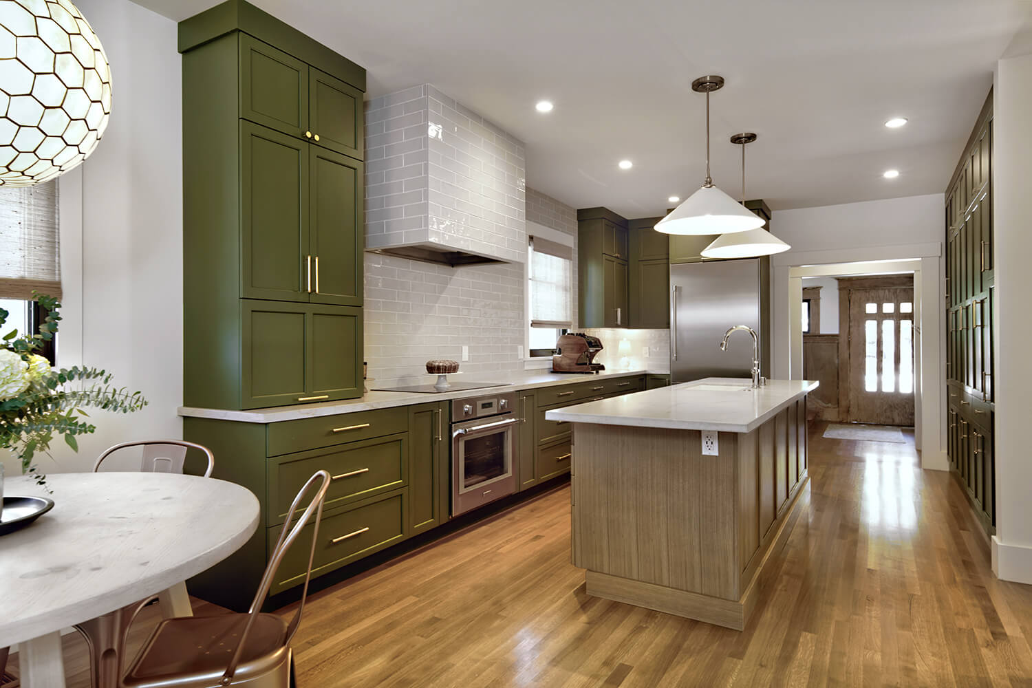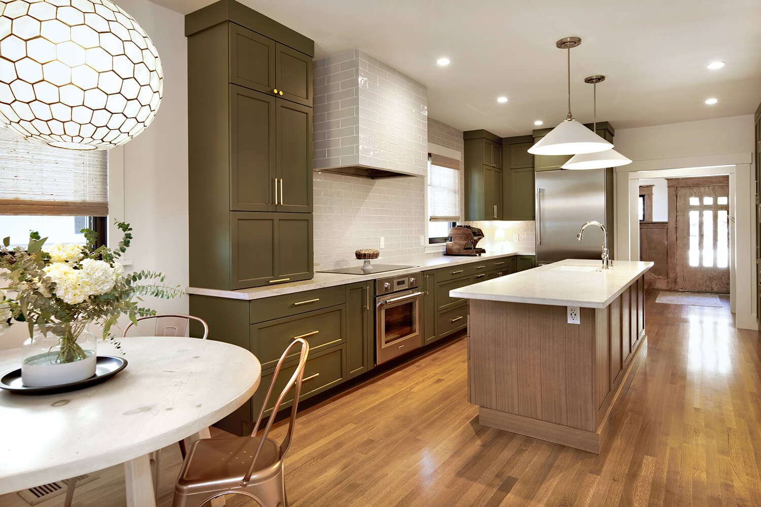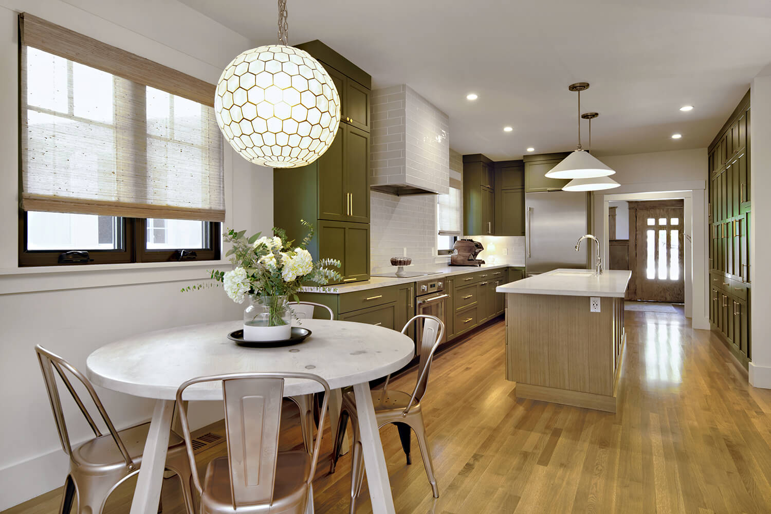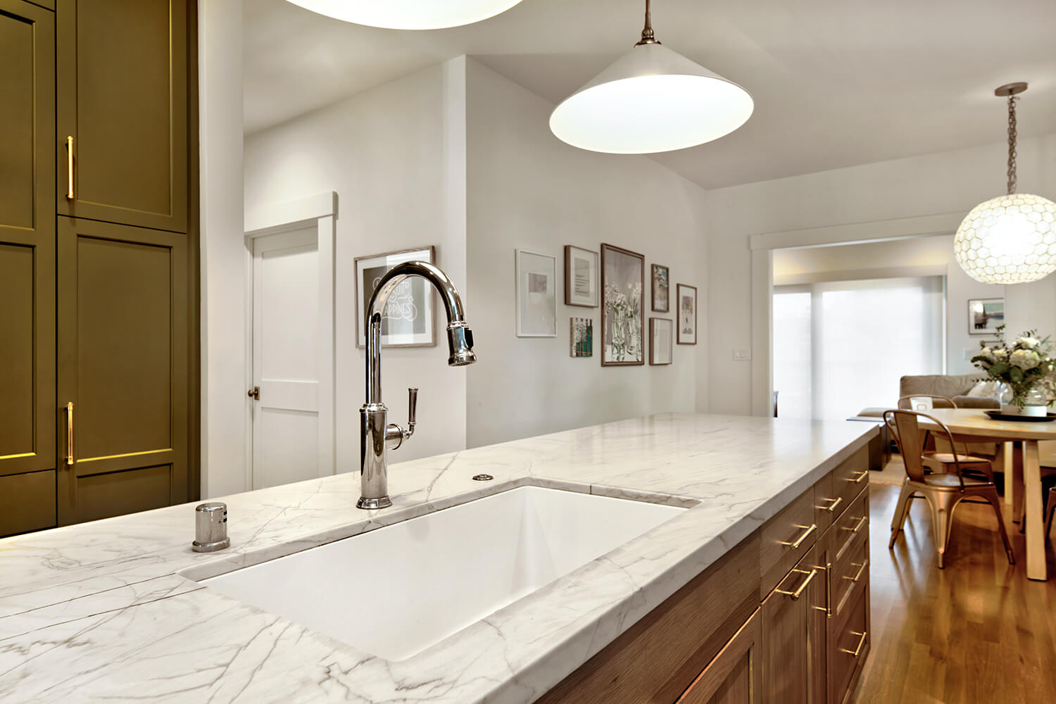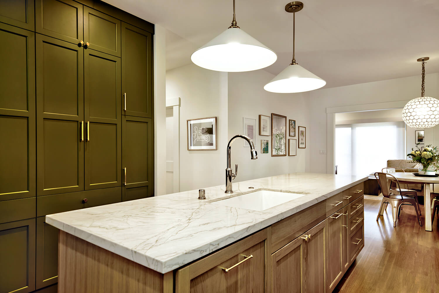 A Fluid Transition We completely reimagined the kitchen’s layout by removing all interior walls, effectively creating a spacious, open-concept environment that flows effortlessly into the adjoining breakfast nook and den. This bold decision not only maximized the available square footage but also allowed for a continuous, unobstructed sightline throughout the entire space.