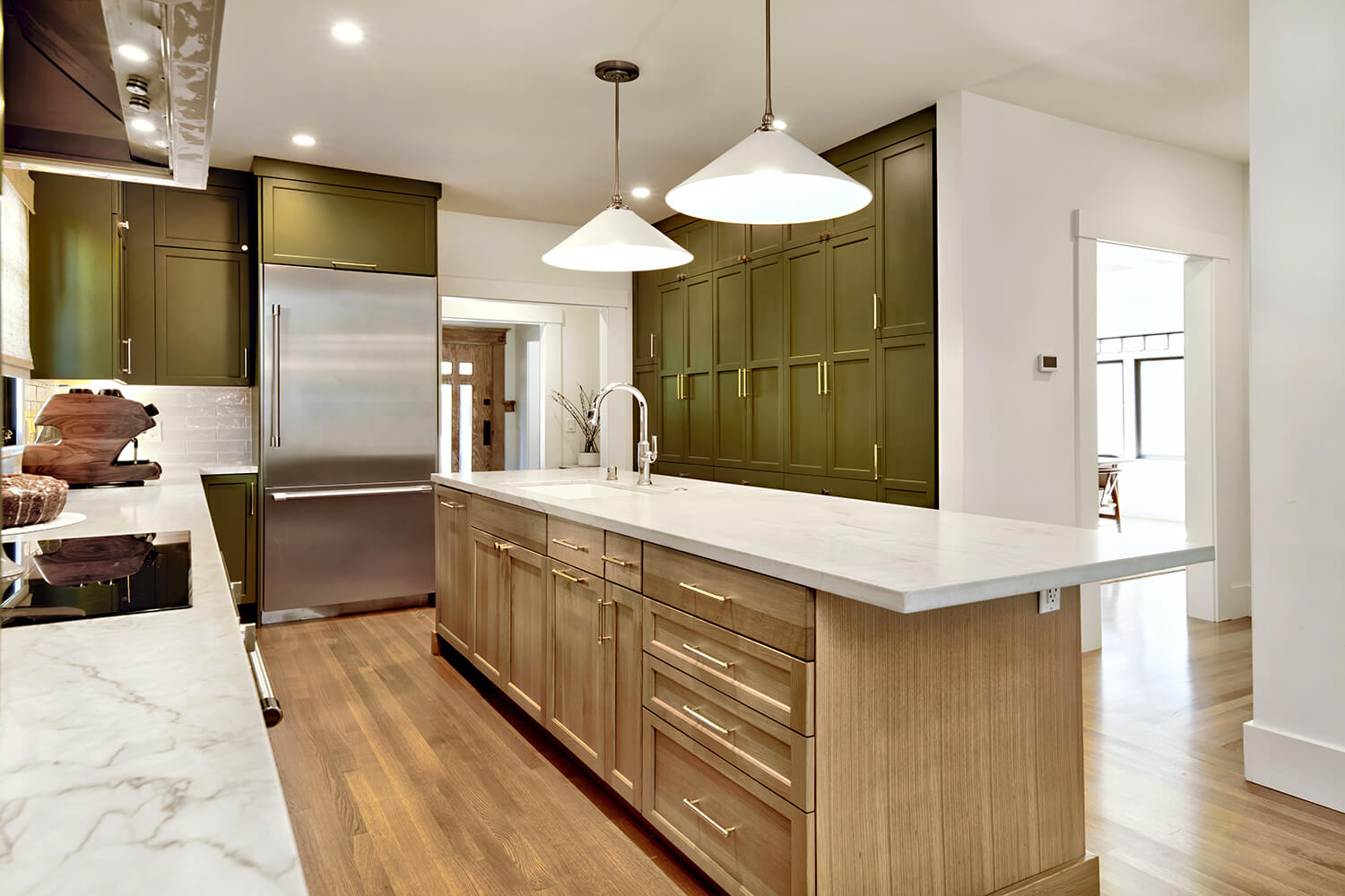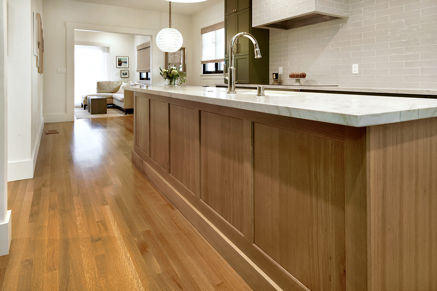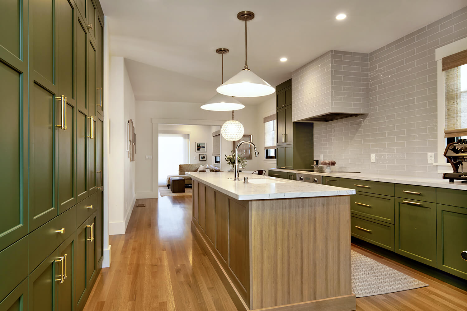 To enhance the fluidity of the design, we chose a soft color palette and high-quality materials that tie the spaces together visually. Thoughtful placement of lighting, along with strategically designed work areas, ensures both functionality and aesthetics are prioritized, transforming the entire space into a modern, multi-purpose area that caters to both cooking and socializing. The result is a kitchen that feels expansive, bright, and effortlessly connected to the rest of the home.